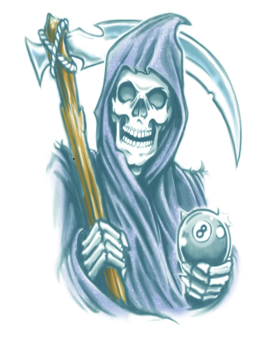 Keine Halloween Party ohne lachenden Sensenmann. Das Biker Klebetattoo Sensenmann zeigt einen euphorischen Reaper. Seine Sense ist mannshoch und in der Hand hält er eine Billardugel mit der Nummer 8. Das msytische Halloween Klebetattoo wird deinem dämonischen Kostüm das gewisse Etwas verleihen und für schauden sorgen. Die Anwendung, mit der du die Halloween Schminke anbringst, ist kinderleicht. Weitere coole Halloween Fake Tattoos wie die Zombie Hand Tattoo mit Filmblut findest du im Shop.
