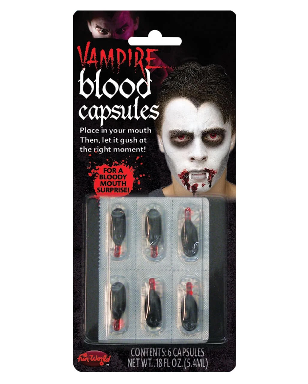 6 Blutkapseln Economy, die mit flüssigem Filmblut gefüllt sind und langsam aus dem Mund tropfen. Der ultimative Lebenssaft für jeden Vampir und der erbarmungslosen, blutrünstigen Bestie!