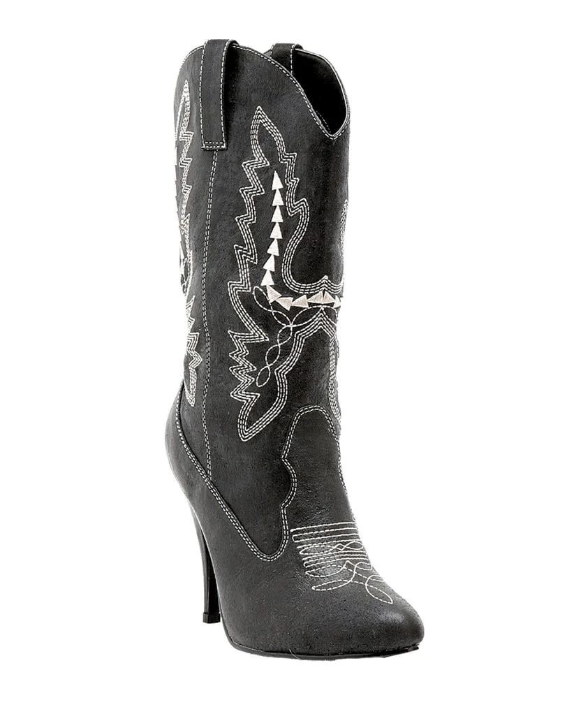 Die schwarzen Damen Cowboy Stiefel sind aus Kunstleder gefertigt und stechen durch ihre markante Bestickung ins Auge. Die helle Stickerei ist in Schleifen auf der Schuhspitze vorne und an den beiden Schaftseiten zu sehen. Alle Nähten wurden ebenfalls mit dem hellen Faden genäht und runden das schicke Gesamtbild perfekt ab. Der Schaft ist oben, wie bei den klassischen Cowboy Stiefeln, nach oben abgerundet. Der Absatz ist ca. 10,5 cm hoch. Der angenehm zu tragende Schuh passt ganz hervorragend zu dem Cowgirl Kostüm mit Cowboy Hut oder dem Cowgirl Kostüm mit Feuerwasser.