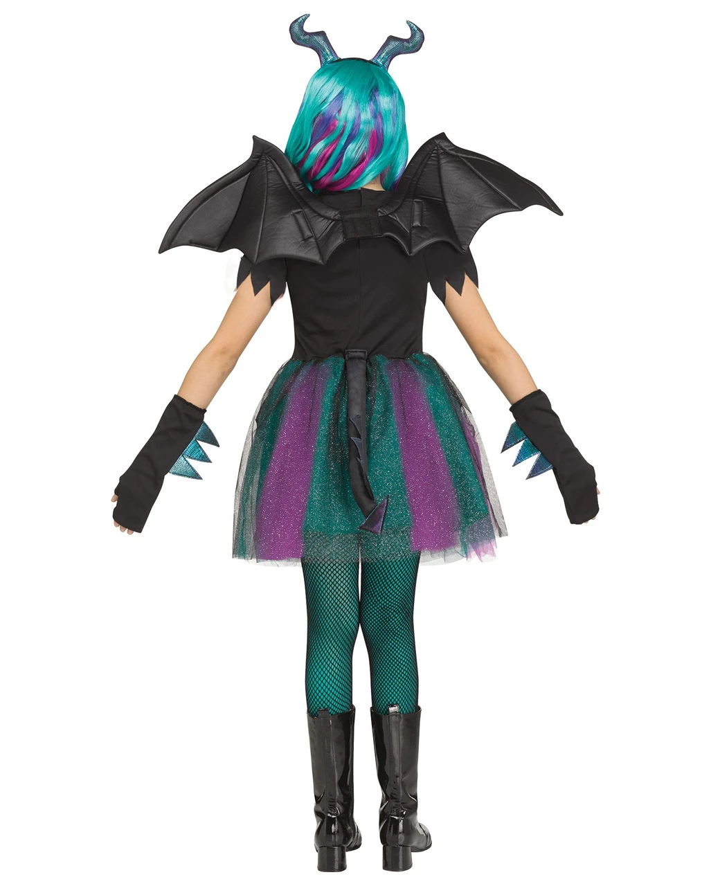 Mit unserem Fantasy Dragon Mädchen Kostüm bekommst du eine Drachen Halloween Verkleidung für deine Tochter! Das Drache Kostümkleid mit Schwänzchen, Flügeln, Armstulpen und Haarreifen ist ein echt cooles Fantasy Kinderkostüm für kleine Dragon-Fans! Die farblich abgesetzten Tüllapplikationen am Rockteil wirken besonders verspielt. Schwarze Flügel, Armstulpen und lustige Drachen-Hörner sind ebenfalls mit dabei und machen den Dragon-Look komplett!