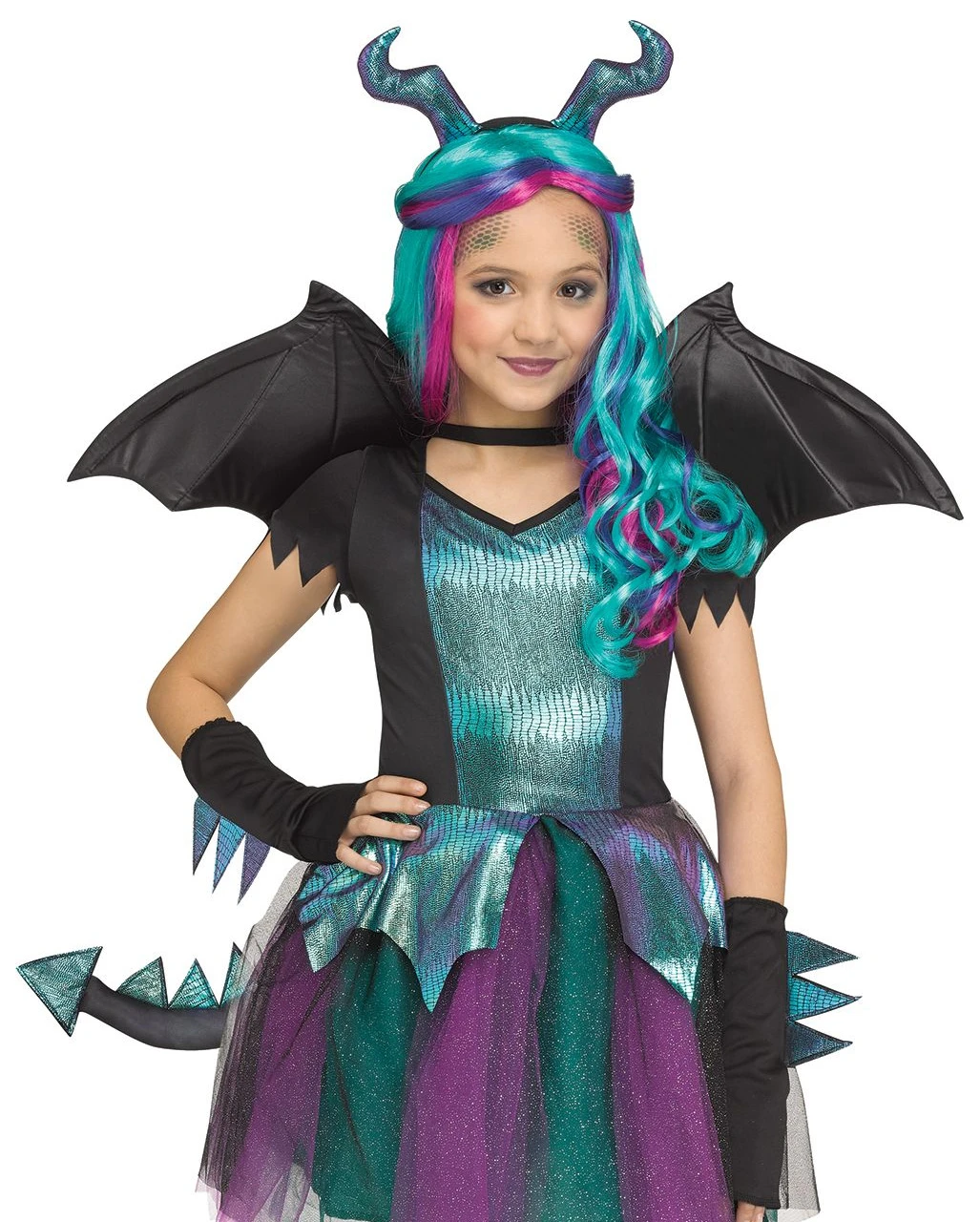 Du bekommst ein Fantasy Dragon Mädchen Kostüm für Kinder zwischen 8 und 16 Jahren. Das Halloween Drachen Kostüm für Kinder ist in M – XL Größe verfügbar. Es handelt sich um ein Dragon Kleid, welches mit einer passenden Strumpfhose und einem Make up mit dem 21-teiliges Fasching & Halloween Make-up Set kombiniert werden kann.