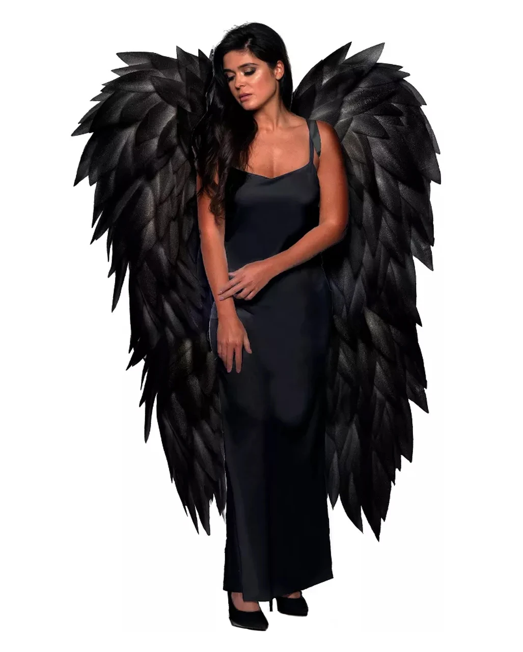 Werde zum gefallenen Engel, zu einem grausamen Dämon oder einer anderen Fantasy-Gestalt! Zu deinem grandiosen Kostüm kommen federlose schwarze Flügel als Ergänzung. Diese Kostümflügel in Schwarz sind bodenlang und ideal für beide Geschlechter geeignet. Das Beste: Sie kommen ohne echte, tierische Federn aus und sind somit auch für Tierfreunde und Veganer geeignet. Die außergewöhnlichen Engelsflügel sind vom Aussehen einzigartig und eignen sich als Accessoire für diverse Kostümideen.