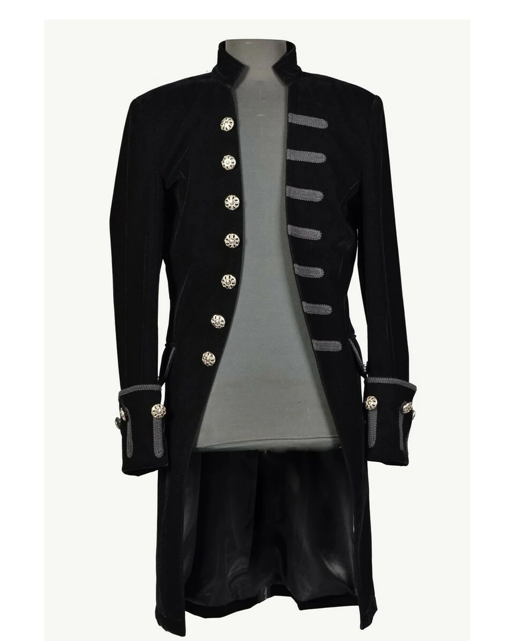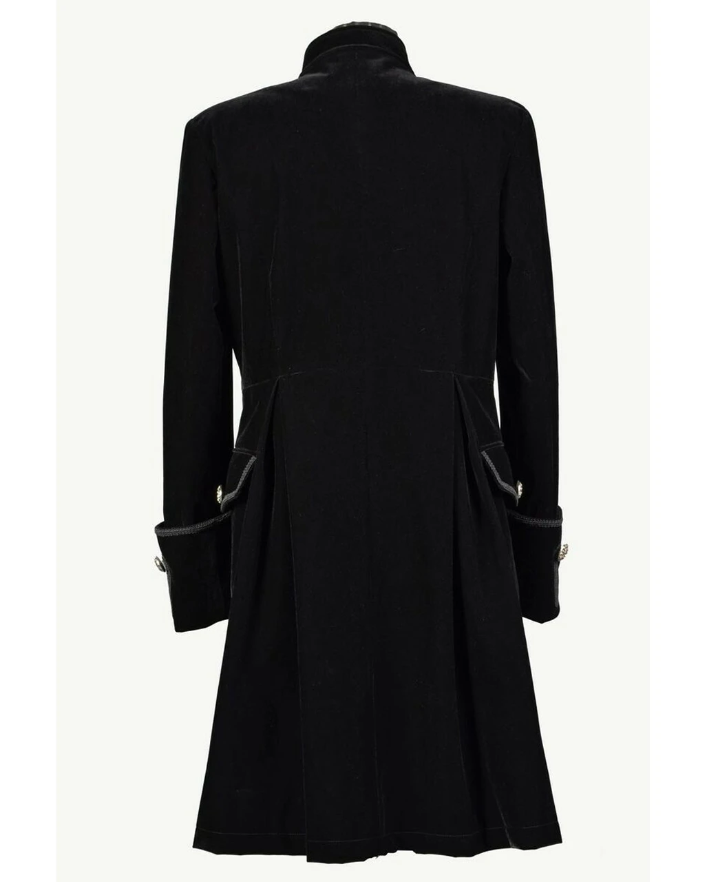 Aristokratischer, halblanger Gothic-Mantel aus schwarzem Samt mit einem abgerundeten Schnitt, der durch eine Reihe silberner Knöpfe auf der Vorderseite und drei silberne Knöpfe an den Ärmeln betont wird. Der elegante Gehrock im Viktorianischen Stil eignet sich von Halloween über Fasching bis zum Steampunk-Event für etliche Anlässe. Unser Mantel besteht aus 55% Baumwolle, 42% Polyester und 3% Elasthan und ist die perfekte Wahl, wenn du eine gute Figur machen möchtest.