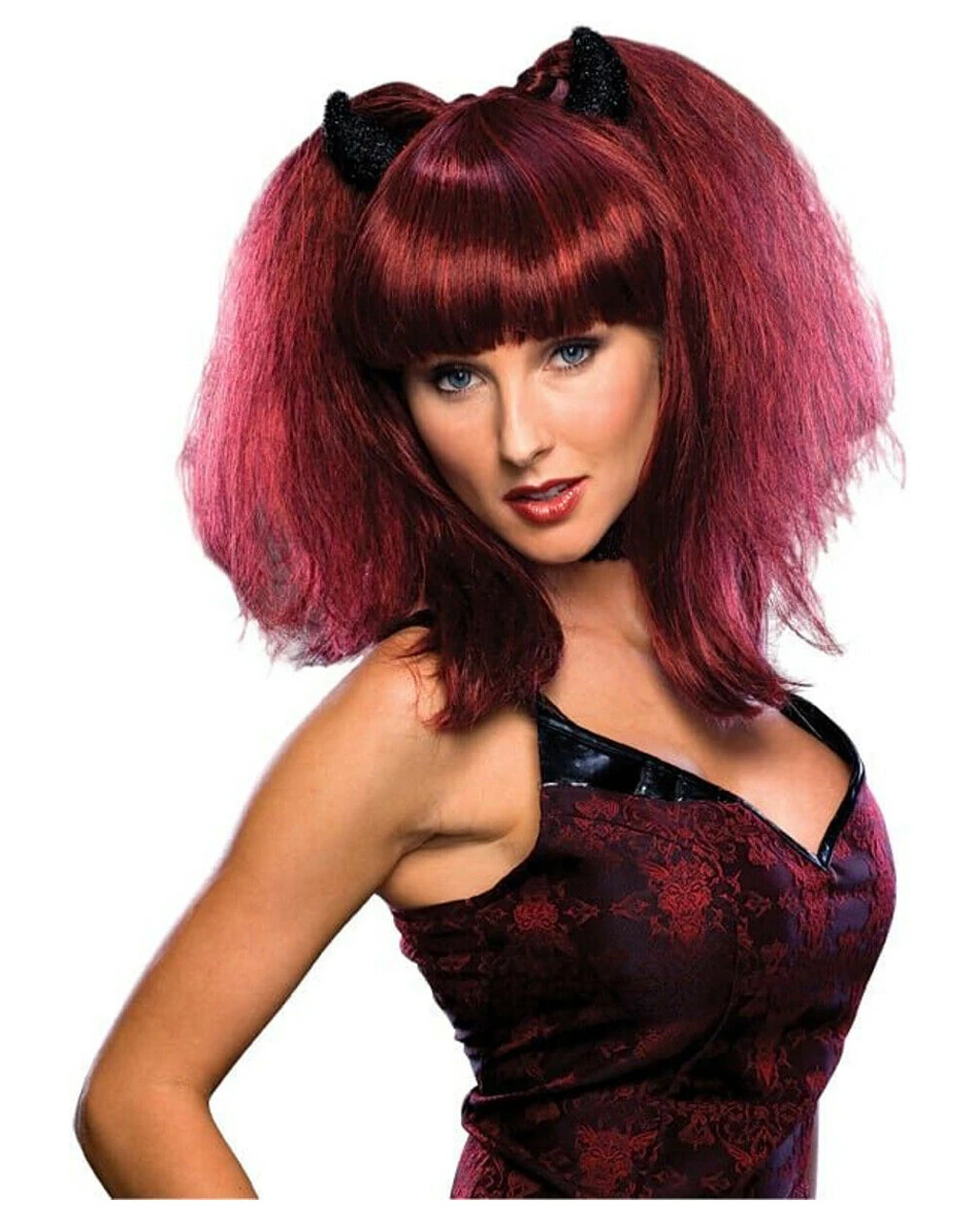 Die Teufelin Perücke mit Hörner besteht aus rot – schwarz gesträhntem Kunsthaar. Der kesse Pony geht bis zu den Augenbrauen. An der linken und rechten Seite ist ein antoupierter Zopf gebunden. Vor den Zöpfen sind 2 schwarz schimmernde Teufelshörner aus Stoff angebracht. Die Haarlänge beträgt ca. 40cm. Für den richtigen Blick sorgen die extra erhältlichen Teufel Kontaktlinsen.