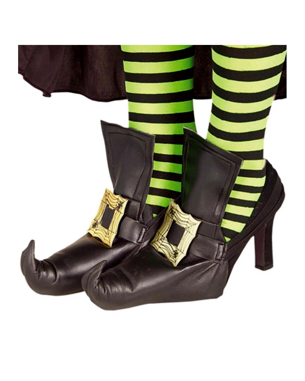 Es handelt sich um Schuhüberzieher, die an der Spitze und an der Lasche mit Draht in Form gebogen werden können. Die Schuhspitzen werden an den eigenen herkömmlichen Pumps mittels Gummibänder fixiert. Die Schuhspitze kann je nach Wunsch noch mit Papier oder Schaumstoff ausgestopft werden. Alles für dein Hexenkostüm findest du in unserem Onlineshop. Hier gibt es auch das fantastische Wicked Witch Kostüm und deinen Gekrümmter Hexenbesen zerlegbar 125 cm