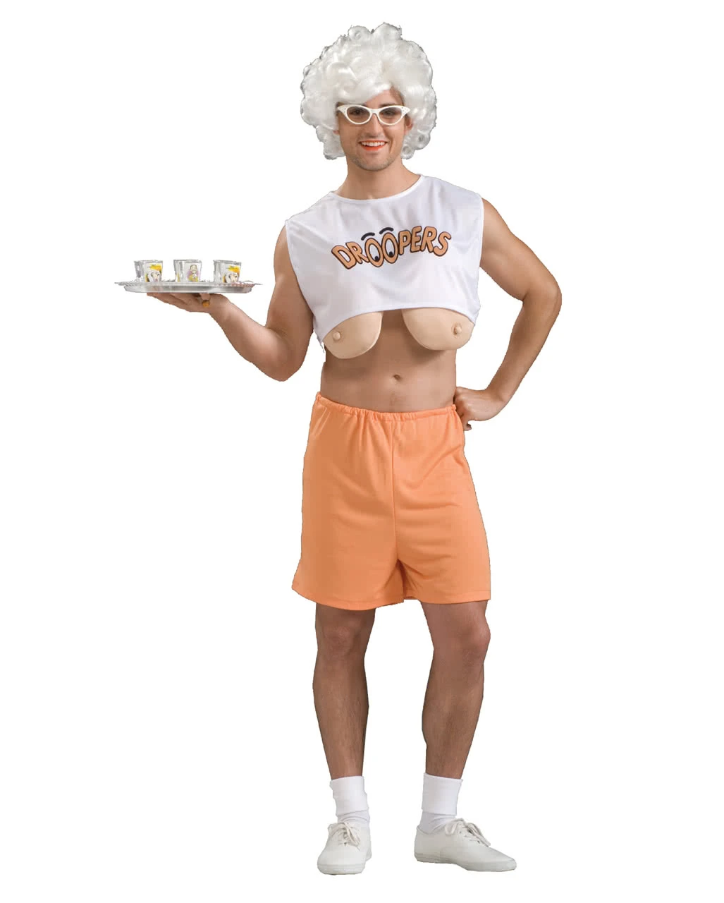 Das abgedrehte Hupen Helga Herren-Kostüm ist ein super freches Karnevals Kostüm und beinhaltet eine orange Short mit elastischem Gummibund, ein weißes Top mit dem orange-schwarzen Aufdruck DROOPERS sowie hängende, mit Schaumstoff gefüllte, Mega-Hupen die du dir mit einem Gummizug um die Schultern schnallen kannst damit sie unter dem Kostümshirt herausspitzeln. Wir haben auch noch das Sexy Schulmädchen Herrenkostüm und das Matrosin Herrenkostüm für die nächsten Bachelor Partys für euch!