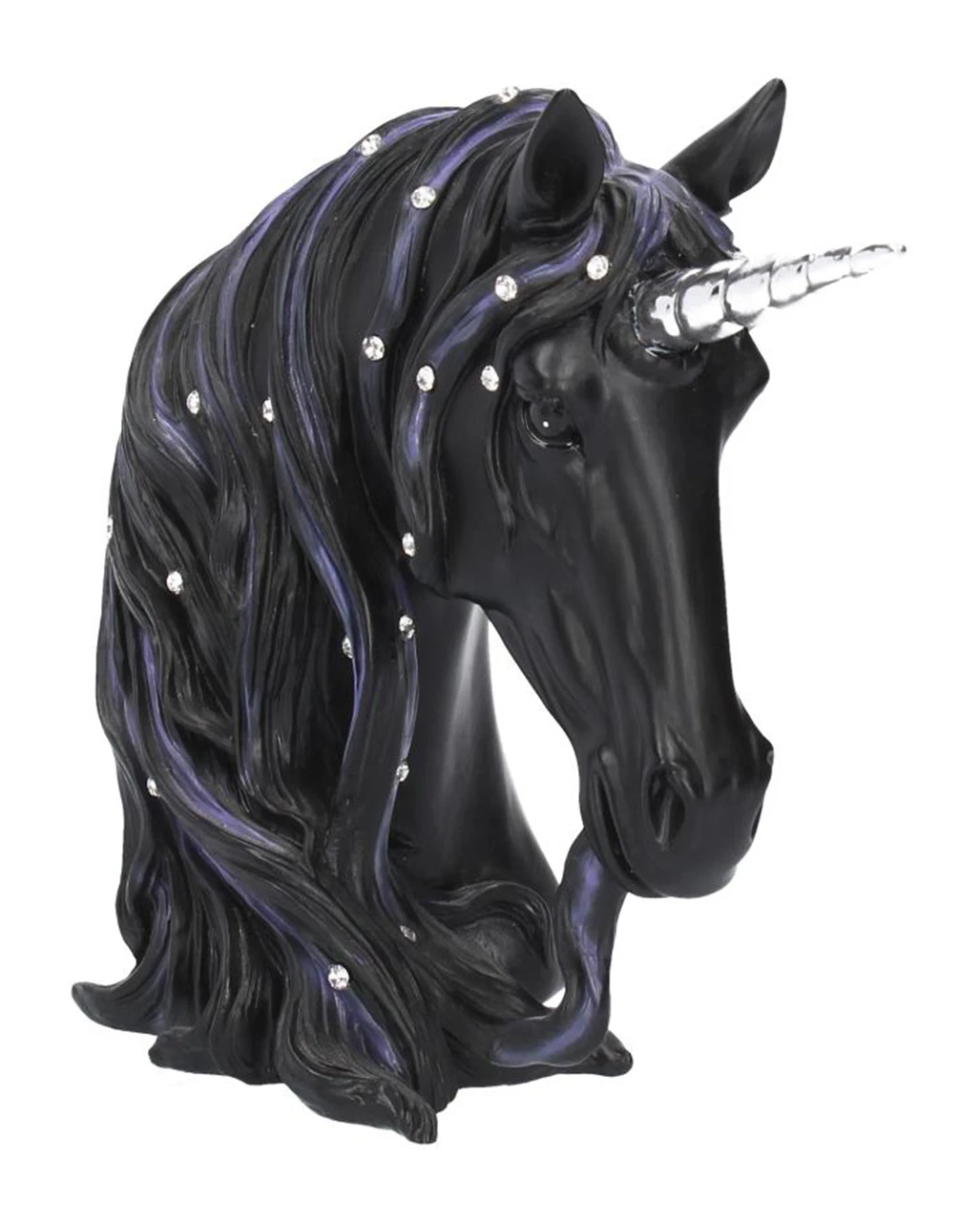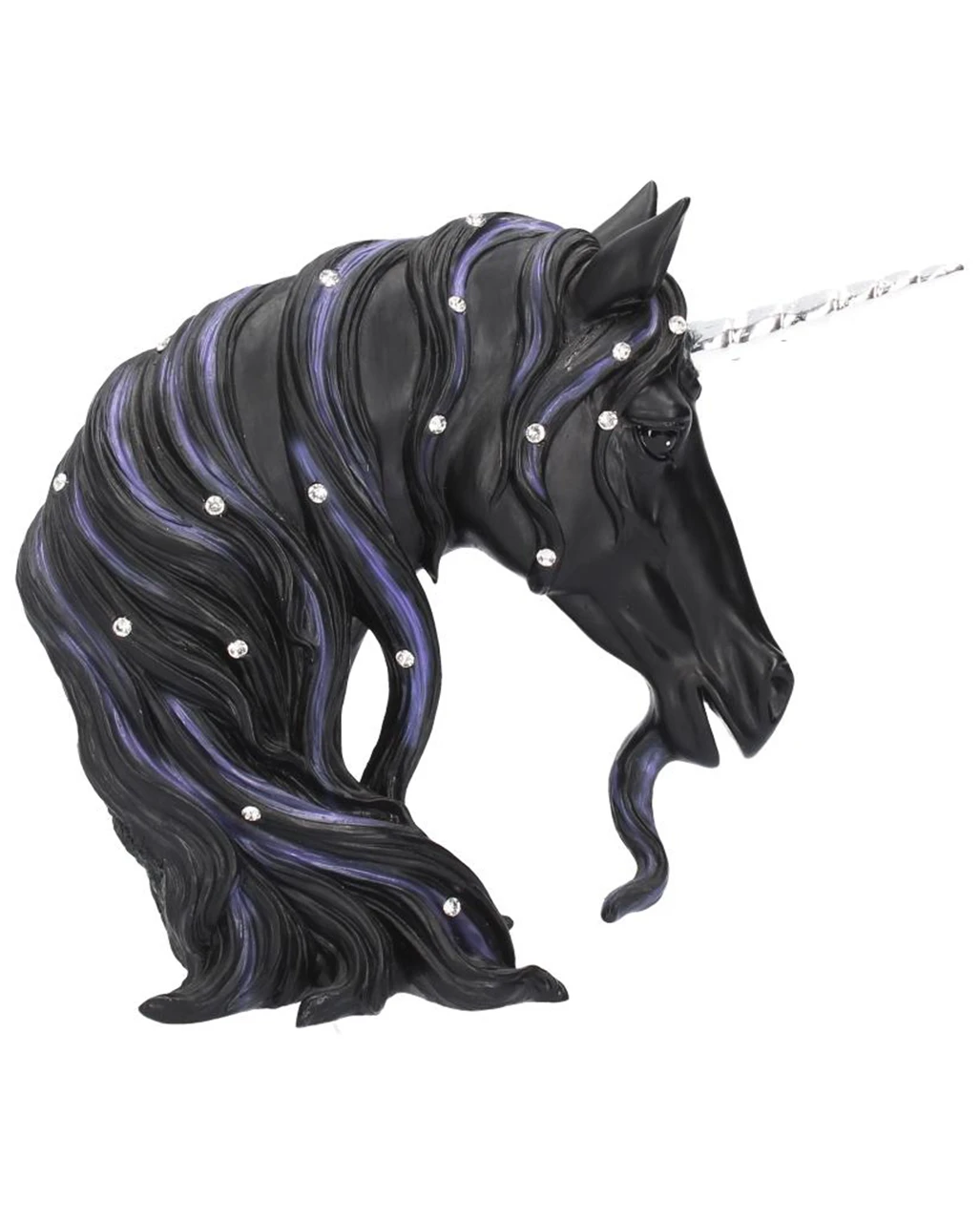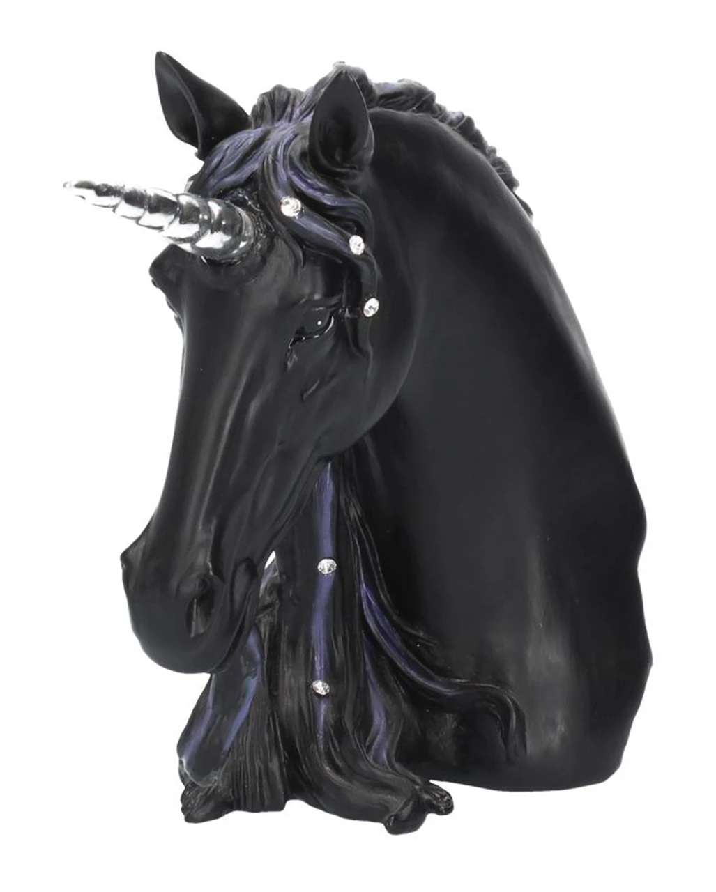 Diese bezaubernde Einhorn-Büste steckt voller, glanzvoller Magie. Das schwarze Einhorn blickt mit tiefschwarzen, seelenvollen Augen nach vorne. Das silberne Horn ragt spiralförmig aus dem Kopf heraus, und die mit Juwelen besetzte Mähne und der Bart sind violett gefärbt.