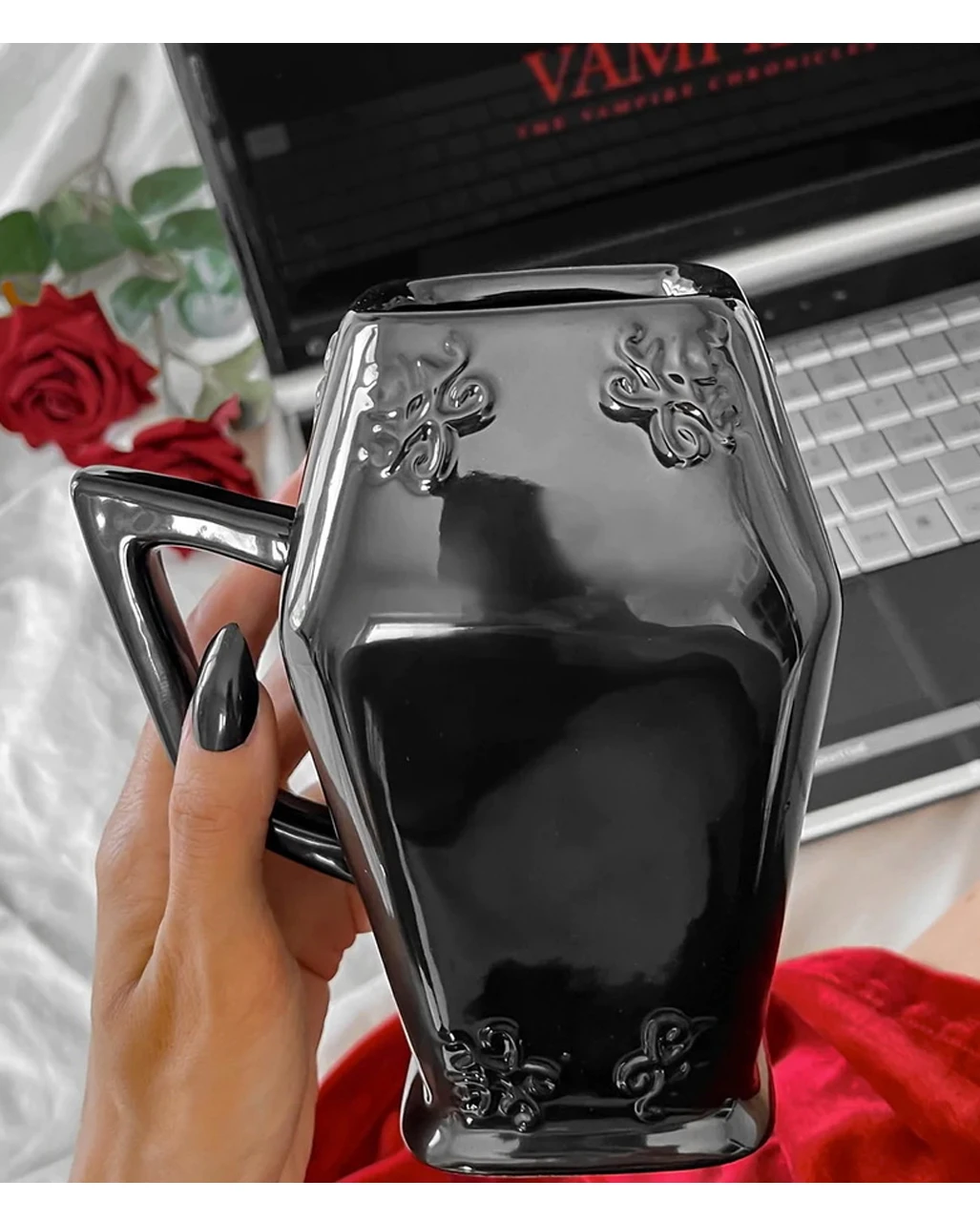 Für die verlängerte Kaffeepause, einen gechillten Filmeabend oder lange Arbeitstage. Die fantastische KILLSTAR Coffin Tasse lässt dich garantiert nicht im Stich. Dank des Fassungsvermögens von ca. 532 ml sorgt sie für reichlich Nachschub in Sachen Kaffee. Auch Tee oder die heiße Schokolade schmecken aus der schwarzen Gothic Tasse einfach länger gut!