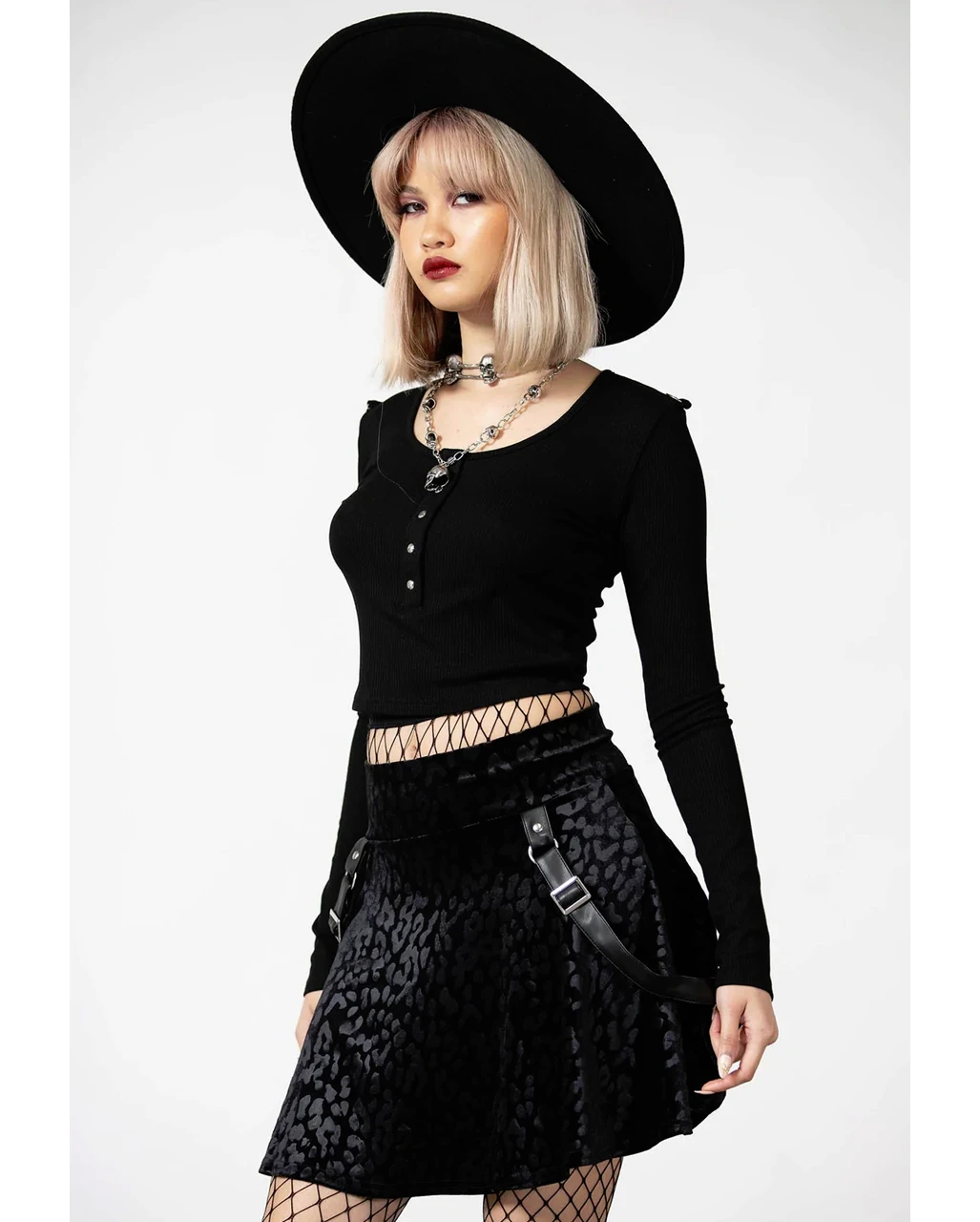 Der KILLSTAR Kitty Pride Skater Rock ist ein schwarzer kurzer Rock mit strategisch platzierten Riemen aus Kunstleder, die du verstellen kannst. Der Gothic Rock ist aus weichem Samtstoff und begeistert mit einem sexy Leoparden Print, einem breiten Bund und coolen Metallbeschlägen. Er ist in den Größen von S bis XL erhältlich. Zu diesem tollen Rock findest du noch viele weitere Gothic Mode Accessoires wie etwa die KILLSTAR Gerta Mesh Strümpfe bei uns im Shop.