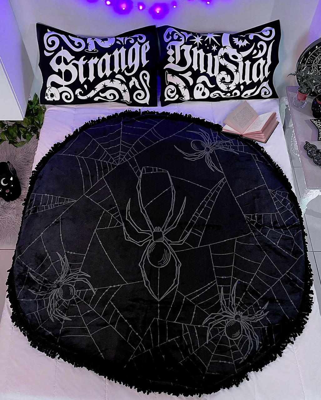 Gönn dir oder einem anderen Gothic Fan dieses fantastische Wohnaccessoire. Die KILLSTAR Spyder Tagesdecke rund begeistert mit einem schaurigen Spinnen Motiv. Die Kuscheldecke ist außerdem aus einem weichen Stoff gefertigt und mit einem detaillierten All-Over-Print versehen. Diese düstre Gothic Homeware ist wirklich das perfekte Stück, um es über deinem Sofa oder Bett zu drapieren oder um sich für Gruselfilme darin einzuwickeln.