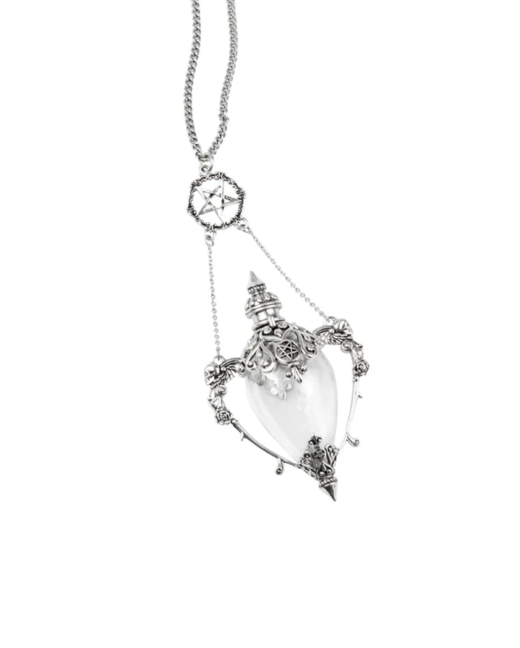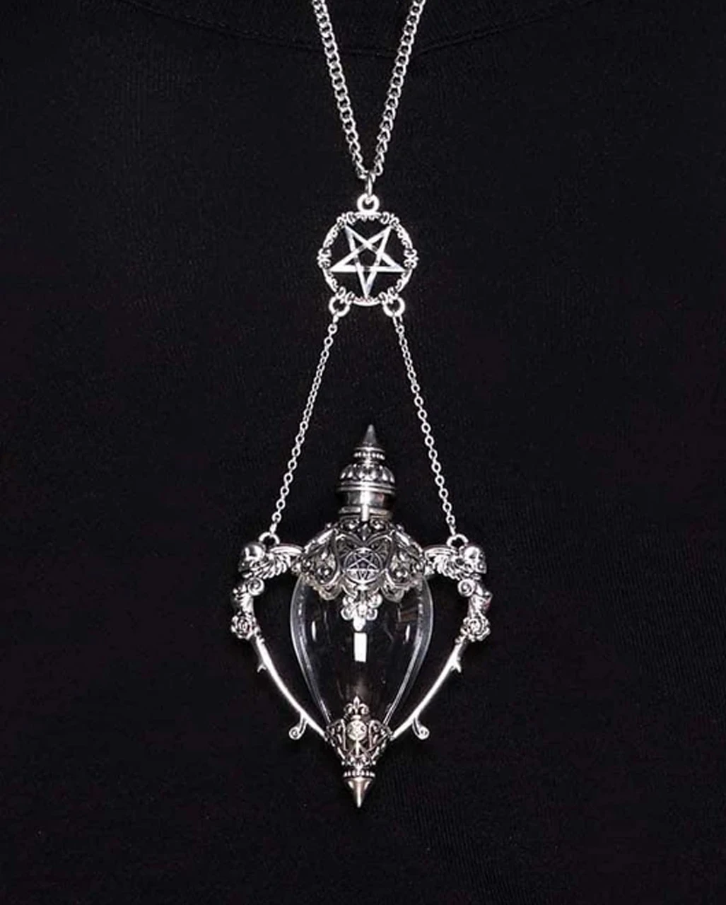 Die KILLSTAR Todeskuss Fläschchen Halskette ist ein echter Hingucker. Die lange silberne Gothic Kette besticht durch einen extravaganten Anhänger, der ein transparentes Fläschchen als Herzstück hat. Der Anhänger ist reichlich mit floralen Mustern verziert und als weiteres Highlight befindet sich oberhalb des Fläschchens ein weiteres Element. Ein silbernes Pentagramm lässt darauf schließen, dass du vielleicht doch einen Zaubertrank in deinem Gothic Halsschmuck verborgen trägst.