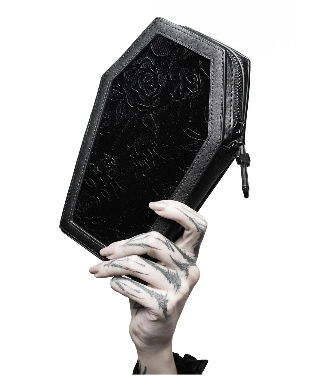 Die KILLSTAR Vampir’s Kiss Sarg Geldbörse ist mehr als ein bloßer Geldbeutel. Es ist ein extravagantes Gothic Mode Accessoire. Mit der Geldbörse in Sarg Form vervollständigst du deinen morbiden Look. Die Sarg-Geldbörse ist eine dunkle Kombination aus luxuriösem Kunstleder und maßgeschneidertem, gebraucht aussehenden Burnout-Samt. Sie ist komplett in einem eleganten Sarg-Design gehalten und damit die perfekte Brieftasche für jeden Vampir! Sie ist außerdem mit einem Reißverschluss und einem Fledermaus Emblem versehen. Groß, aber dennoch leicht, bietet sie Platz für Bargeld, Dokumente und magische Amulette. Passend dazu findest du bei uns die Sarg als Gothic Handtasche.