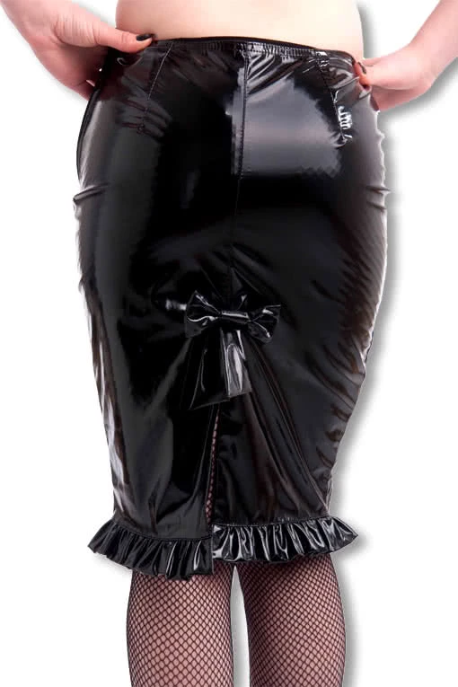 Der klassische Lack Bleistiftrock verpasst dir durch seine schmale, gerade Form eine wahnsinns Figur und eignet sich ideal für jedes Burlesque, Fetisch oder Bondage Outfit. Der Gothic Rock hat einen seitlichen Reißverschluss und einen Gehschlitz an der Rückseite, der mit einer hübschen Lackschleife verziert ist. Am Saum des Lack Rocks schwarz befinden sich dekorative Rüschen, die deinem Lack Outfit einen frechen Look verpassen.