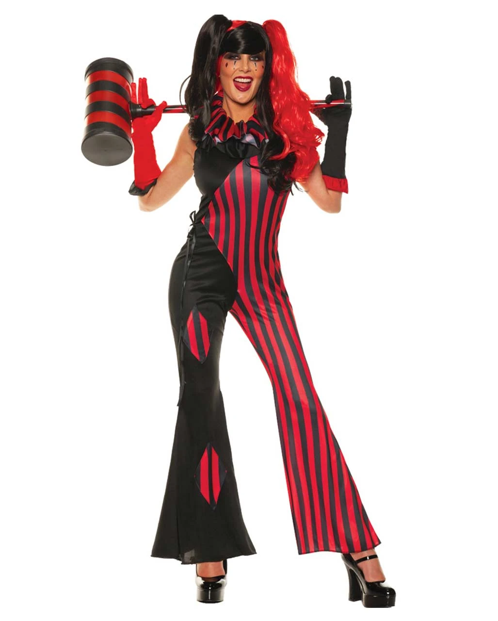 Das Misfit Harlekin Kostüm kommt mit einem Jumpsuit als Streifen Kostüm in Rot-schwarz. Mit dabei sind ein Paar Handschuhe und 1 Harlekin Kragen. Das Clown Damenkostüm ist ärmellos und zeigt etwas Haut. Somit ist es perfekt für deinen sexy Auftritt als Harlekin Frau. Die Verkleidung ist bis Größe 46 erhältlich! Entdecke auch unseren Harley Quinn Hammer aufblasbar als Spielzeugwaffe für unheimliche Horror-Clown Kostüme!