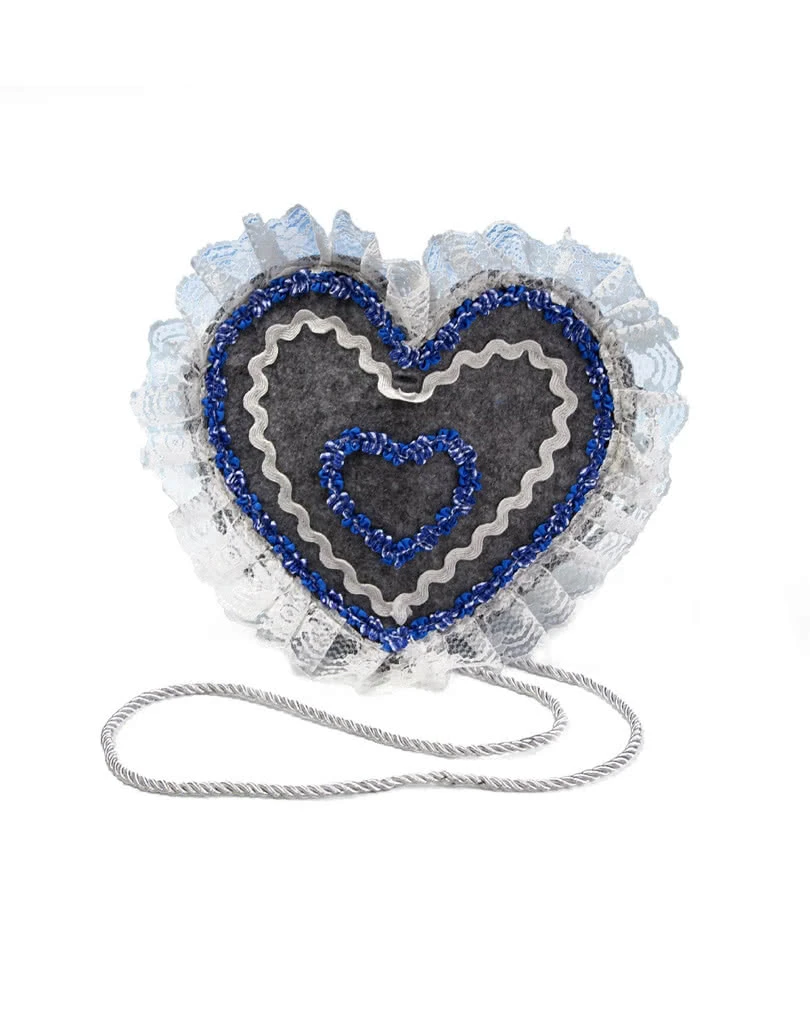 Die Oktoberfest Trachtentasche hat die Form eine großen Herzen mit weißen Spitzen und mehreren kleineren blau/weißen Herzchen, die auf dem grauen Untergrund aufgenäht sind. Mit Hilfe der langen Kordel lässt sich die Tasche lässig umhängen, um dann im Inneren wertvolle Gegenstände wie Geldbeutel und Handy zu verstauen. Für den passenden Oktoberfest-Look empfehlen außerdem wir für sie das Trachten Liesl Kostüm und für ihn die Trachten Kniebund Lederhose.