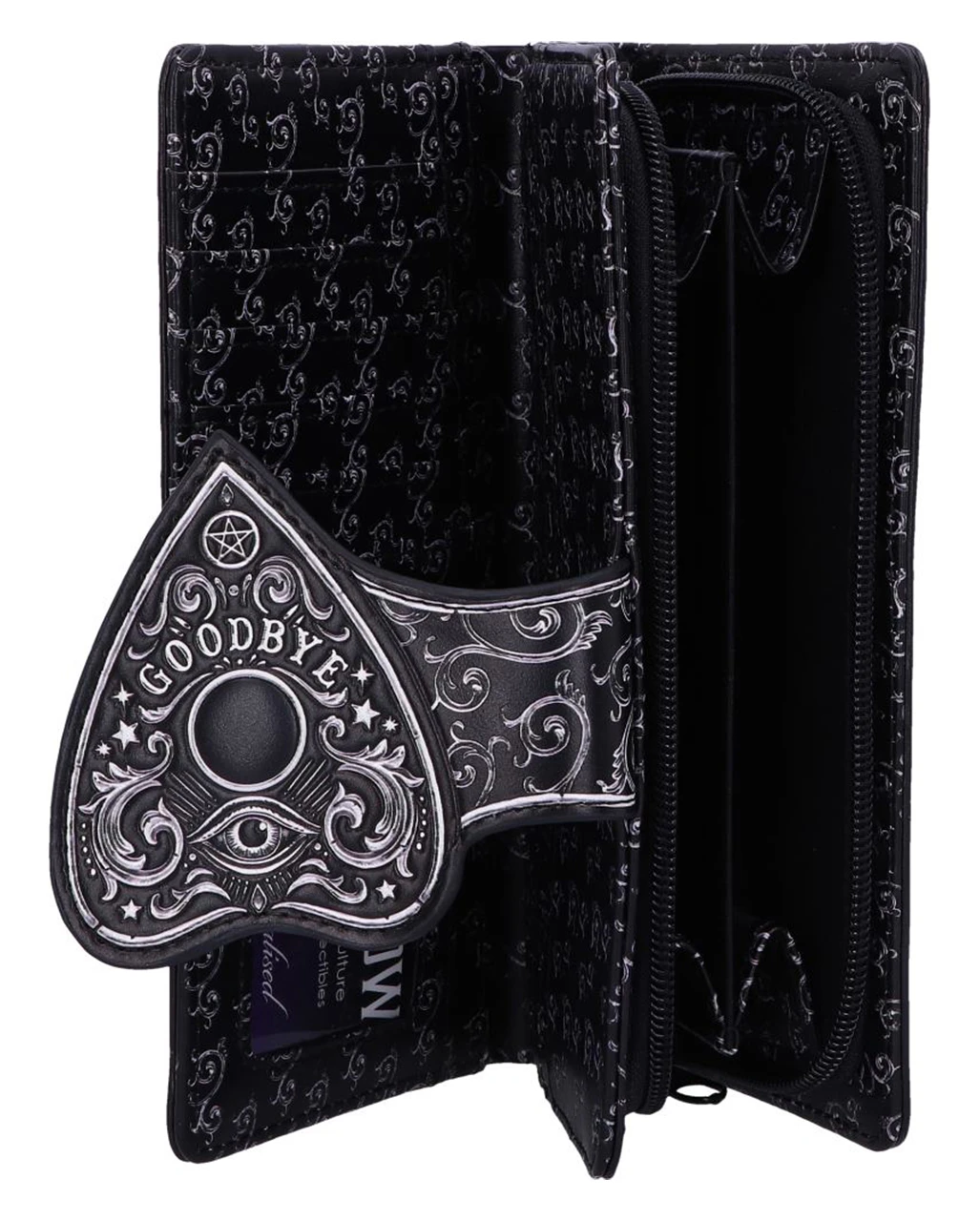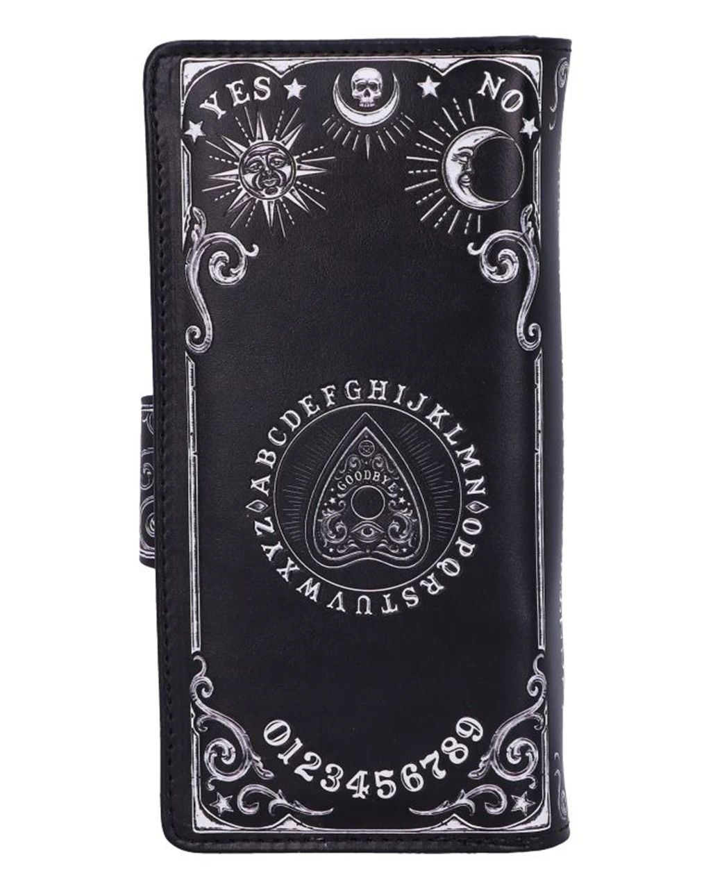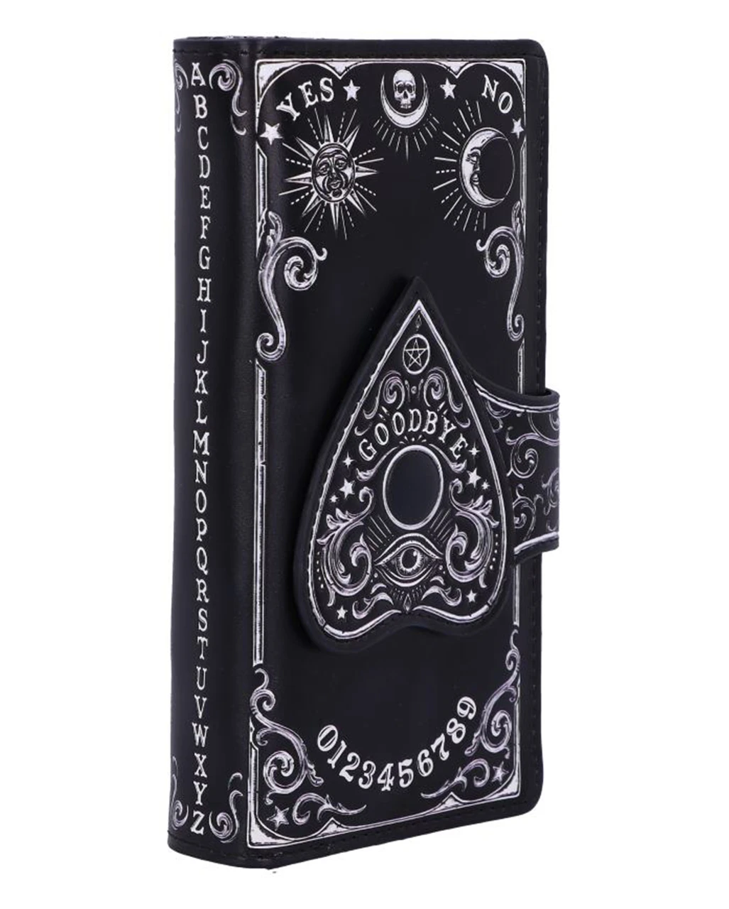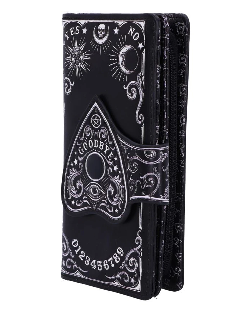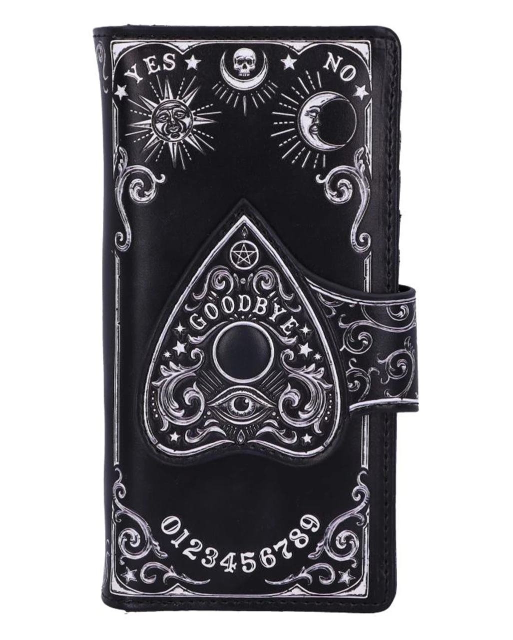 Hol dir den Ouija Brett Planchette Geldbeutel für dein perfektes Gothic Mode Outfit. Mit einer Planchette (Zeiger), die als Verschluss des Geldbeutels fungiert, sowie den Zahlen 0 bis 9 und den Worten YES und NO ist deine mystische Geldbörse, genau das richtige für Wicca & Pagan Fans. Die geprägten Details verstärken die zauberhafte Magie und erzeugen einen auffälligen 3D-Effekt. Verschiedene Fächer für Geldscheine, Karten und Kleingeld machen den Gothic Geldbeutel außerdem zu einem fantastischen Geschenk für eine Hexenfreundin.