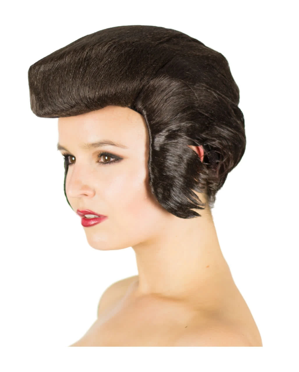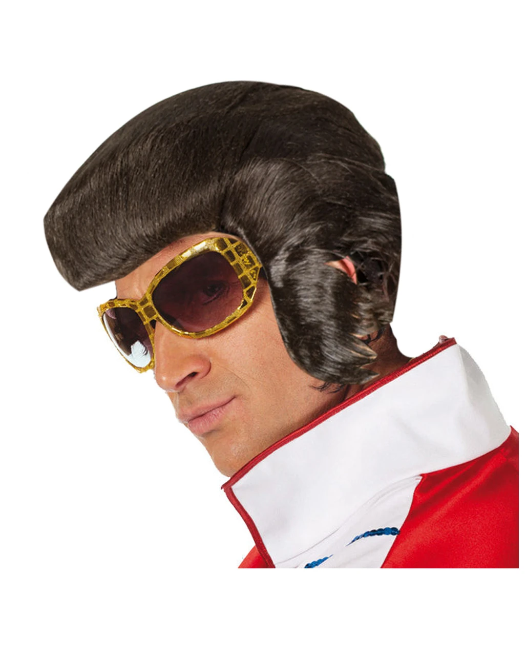 Die braune Perücke Rock King entspricht in Form und Design dem Stil der Rock Ikonen aus den 60er Jahren. Die künstlichen Haare wirken streng nach hinten gegelt und vorne sind sie zu einer charakteristischen Tolle aufgetürmt. Zwei mächtige, seitlich angebrachte Koteletten vervollständigen den rockigen Look. Ein innen eingearbeitetes Netz sorgt dafür, dass die Faschingsperücke angenehm und ohne störendes Jucken zu tragen ist. Dazu passen das Elvis Presley Kostüm und das Party Mikrofon.