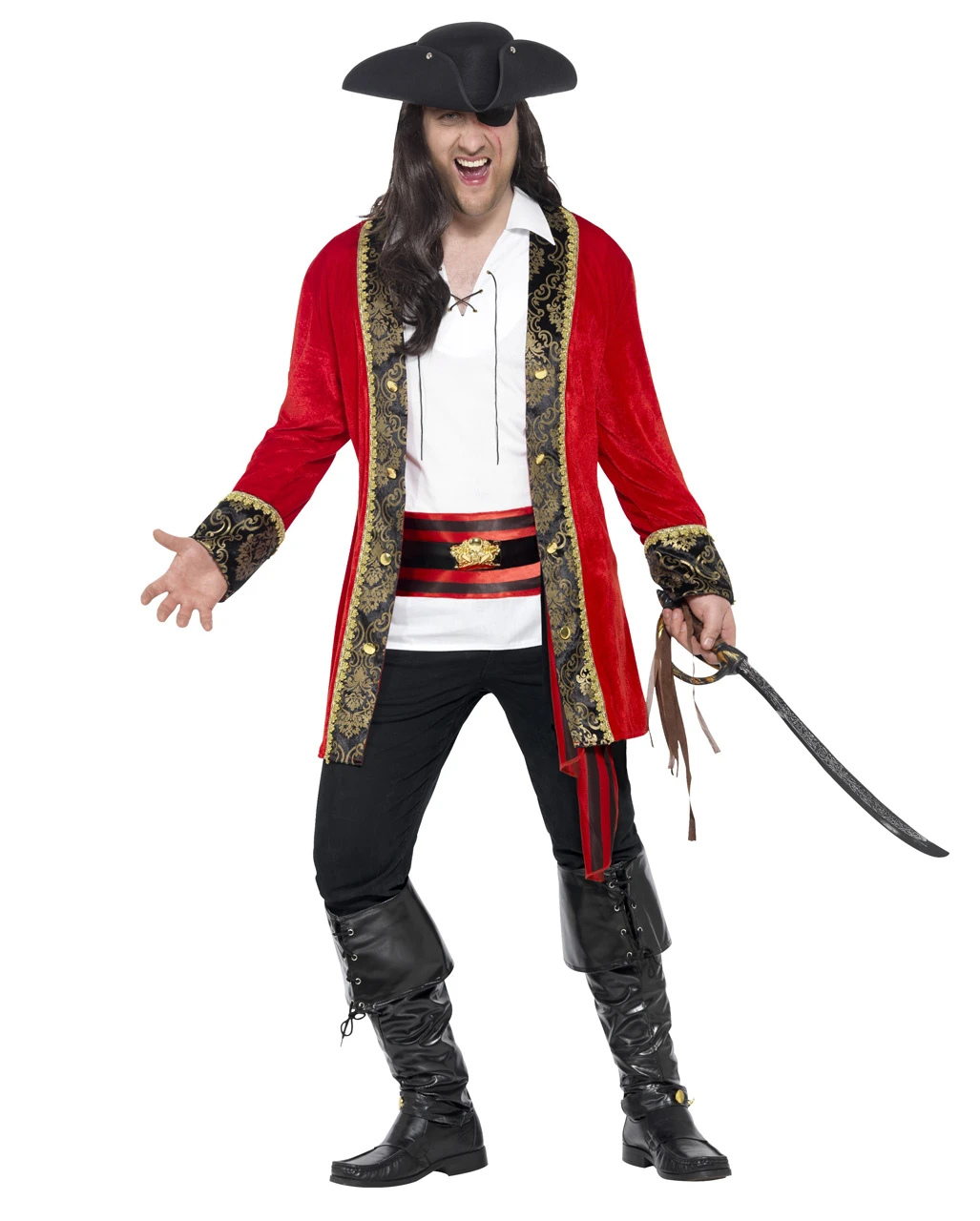 Das Piraten Kapitän Plus Size Kostüm ist in XL & XXL Größe erhältlich. Es besteht aus einer roten Jacke mit schwarz-goldener Borte an Ärmeln und Revers, einem weißen Oberteil und einer breiten Taillenschärpe. Kombiniere das Seeräuber Plus Size Kostüm mit unserer Kniebundhose Beige aus Samt und weißen Kniestrümpfen, die du ebenfalls in unserem Shop bekommst. Fertig ist dein Piraten-Look. Für die gruselige Halloween Variation ist das Geister Pirat Kostüm XL die perfekte Wahl.