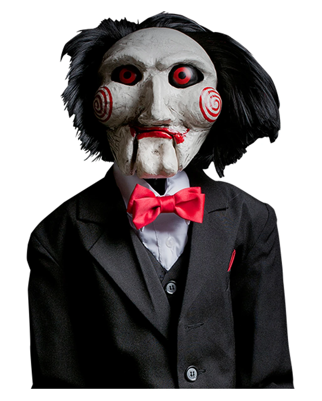 Verwandle dein Zuhause in eine wahre Folterkammer mit unserer SAW Billy Puppe! Die 105cm große Deko Figur wird deinen Gästen auf den anstehenden Halloween Feiern, Horror Festen und Mottopartys unter Garantie einen riesen Schrecken einjagen!