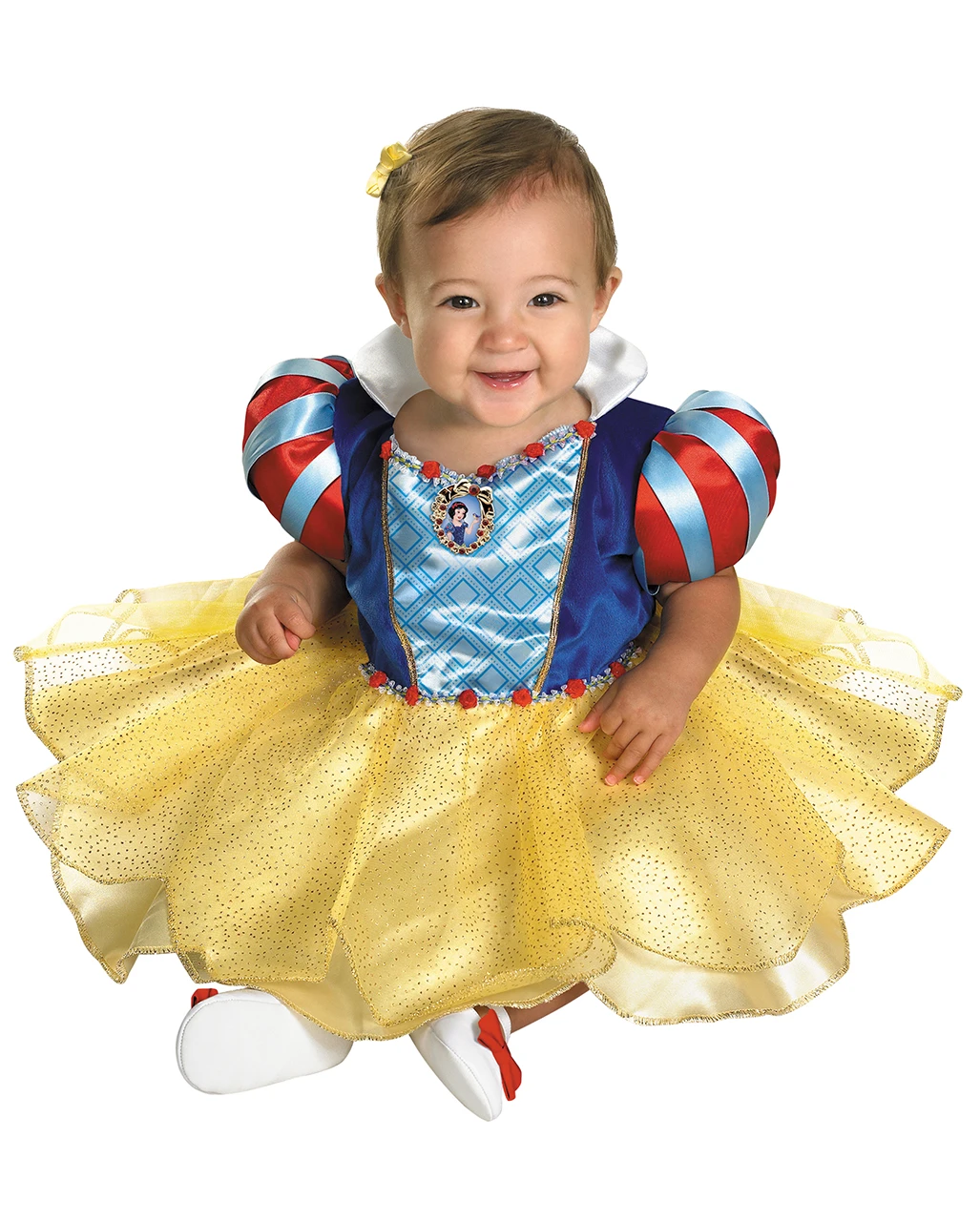 Das Schneewittchen Babykostüm ist die ideale Verkleidung für den ersten Fasching eurer Tochter. Das bildschöne Kostümkleid ist ein original lizenziertes Kostüm und daher dem Kleid der großen Schneewittchen exakt nachempfunden. Das Gelb des Rocks strahlt mit der Sonne um die Wette und die niedlichen blau-rot gestreiften Puffärmel passen perfekt zu den kleinen Babyärmchen. Der Brustbereich sieht edel wie beim Kleid der echten Disney Prinzessin aus, schließlich ist auch ihr Konterfei darauf zu sehen.
