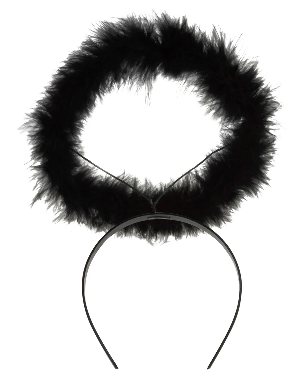 Der Schwarze Engel Heiligenschein ist ein schwarzer Haarreif auf den mit Draht der schwarze Heiligenschein aus schwarzen Marabou-Federn angebracht ist. Er ergänzt perfekt das Gefallener Engel Kostüm.