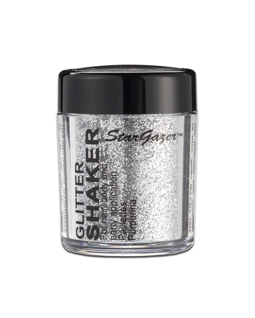 Der fantastische Glitter Shaker Silber mit irre reflektierenden Glitzerpartikeln lässt sich ganz einfach mit einem Pinsel oder mit den Fingern auftragen. Mit Stargazer Make Up Produkten wird das das Schminken wieder zum Erlebnis. Der Stargazer Glitter Shaker Silber wird in einem kleinem Döschen mit Schraubverschluss geliefert.