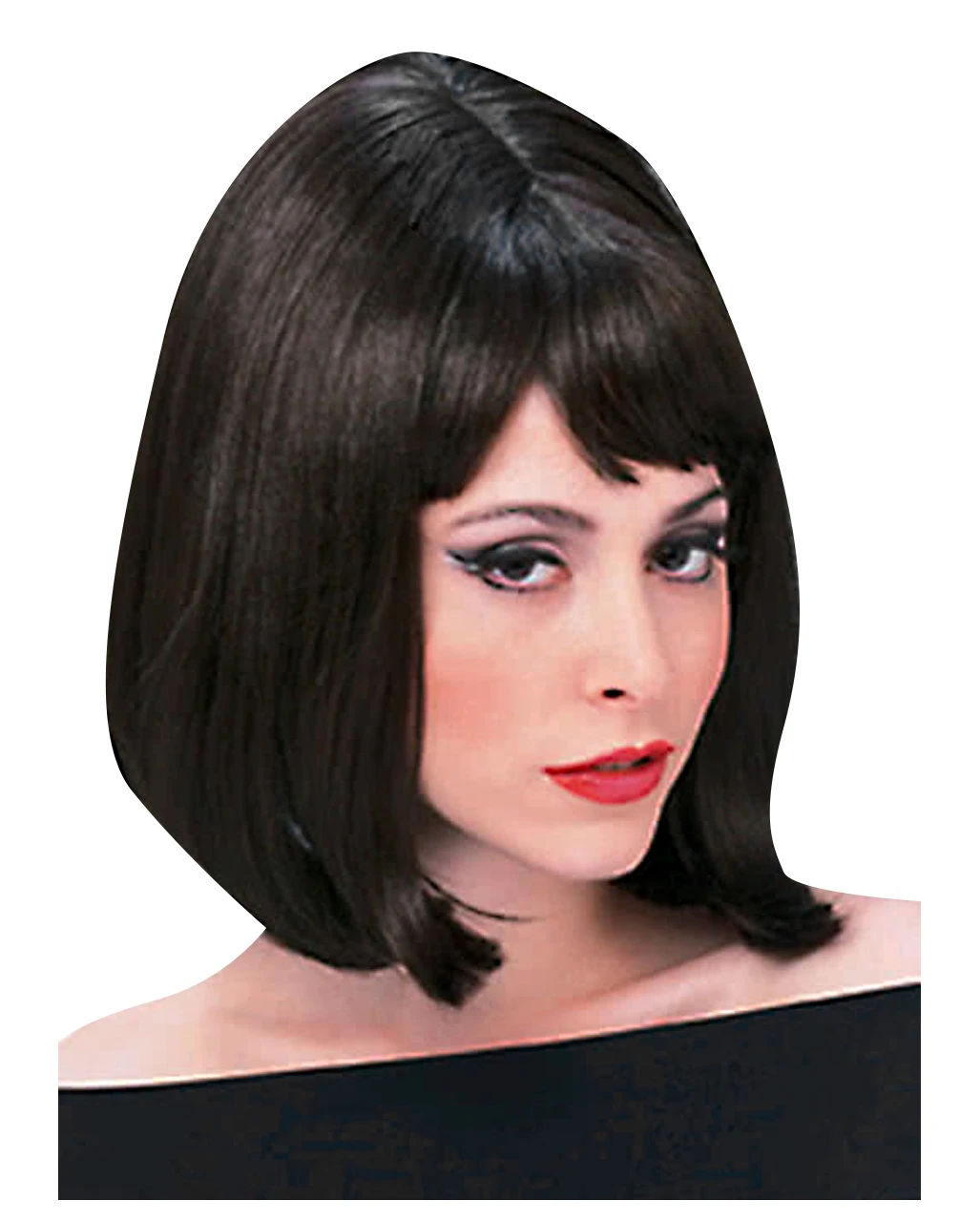 Die 60er Jahre Look Starlet Perücke ist aus schwarzem, glatten, schulterlangen Kunsthaar mit Mittelscheitel und zusätzlichem zu einen frechen Pony frisiert. Die für die damalige Zeit typische Frisur ist am Hinterkopf toupiert und leicht fransig geschnitten. Eine glamoröse Karnevalsperücke die hervorragend zu unseren Brillen aus dem Brille 50er Retro Look pink passt.