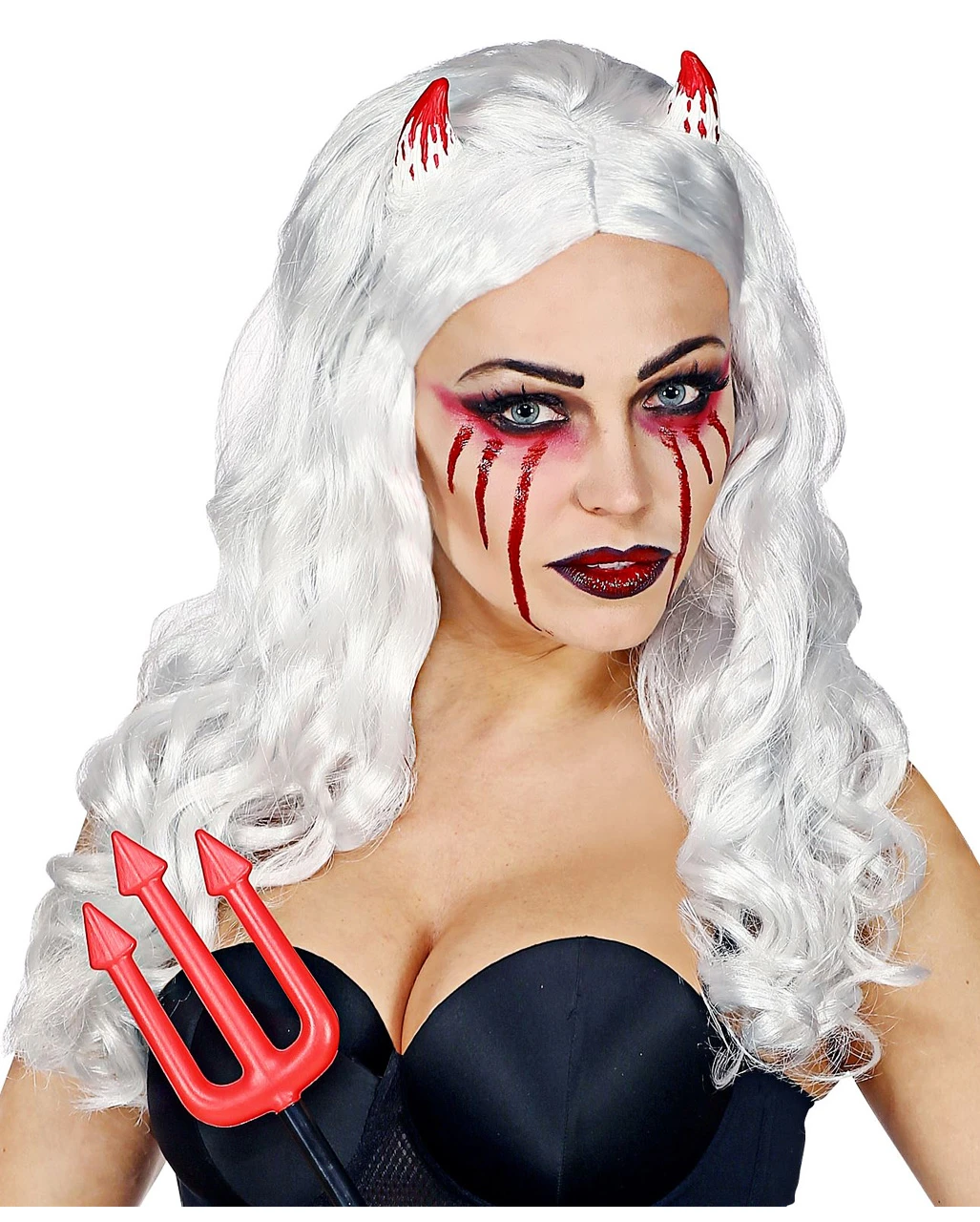 Weiße Halloween Perücke mit blutigen Hörnern als Kostümzubehör